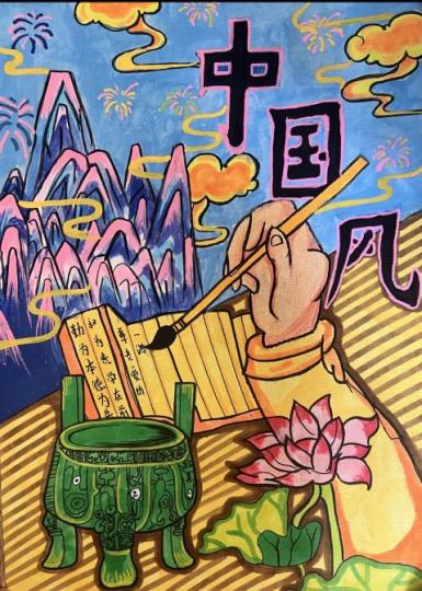 作品介绍:我画的这幅《家风长卷》以毛笔书写家训、书柬传递家风。古鼎镇守其中,代表家规厚重;清荷映照门庭,喻示品德高洁;远山环抱家园,彰显家脉深远。通过水墨丹青,将“忠厚传家久,诗书继世长”的家风娓娓道来,弘扬优良家风代代相传的文化力量。