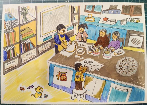 作品介绍:这副作品描述了我和家人一起包饺子的画面,爸爸说,一个小小的饺子可以包进万物,可以是辣辣的韭菜、酸酸的西红柿、甜甜的西葫芦,看,这是我做的小车饺子、小星星饺子,里面包着开开心心。